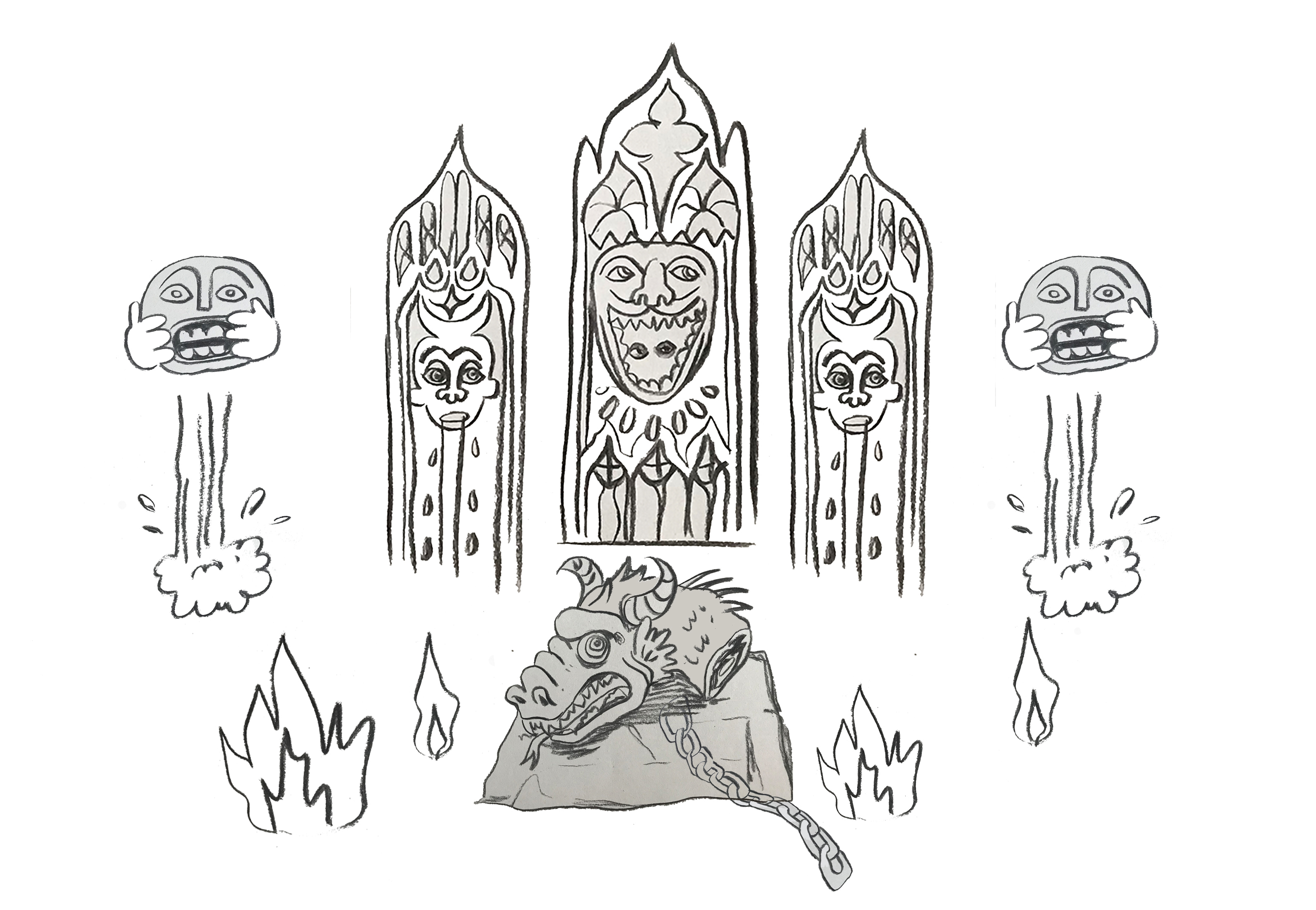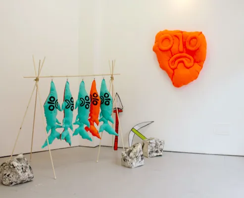 Gargoyle's Lament is a multimedia installation inspired by the French folktale of the Gargouille, a sea serpent that terrorised the river Seine. A young priest offered to slay the beast and in return asked for a church to be built. The Gargouille was burned at the stake but its head remained intact and was mounted on the church as a symbol of divine power. This artist installation offers the gargoyle’s perspective on the death of Gargouille, idealising the sacred head of the serpent. Through Weaver's interpretation of the story, themes of communal behaviour, structures of identity and ritualised idolatry are explored. Papier-mâché is used in contrast to silky fabric tapestries, representing the materiality and crude character of the gargoyle while referencing religious art traditions.